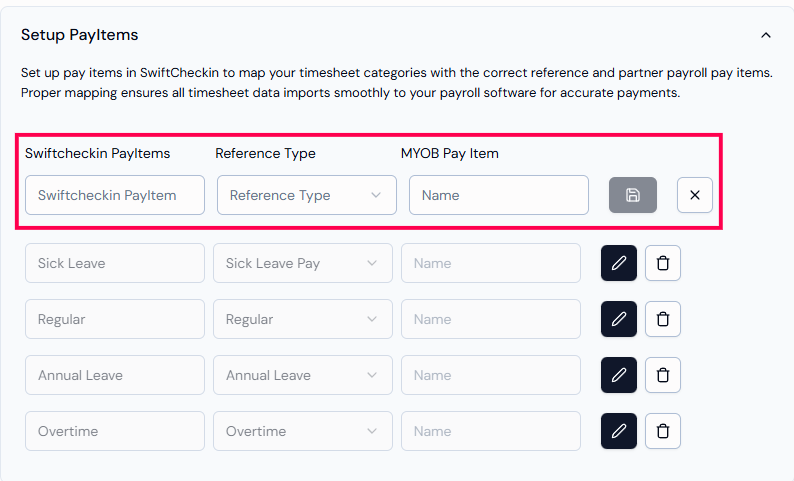 Pay item references are the built-in timesheet types used in SwiftCheckin. You can also create your own pay items, as long as they match with the ones used in SwiftCheckin.