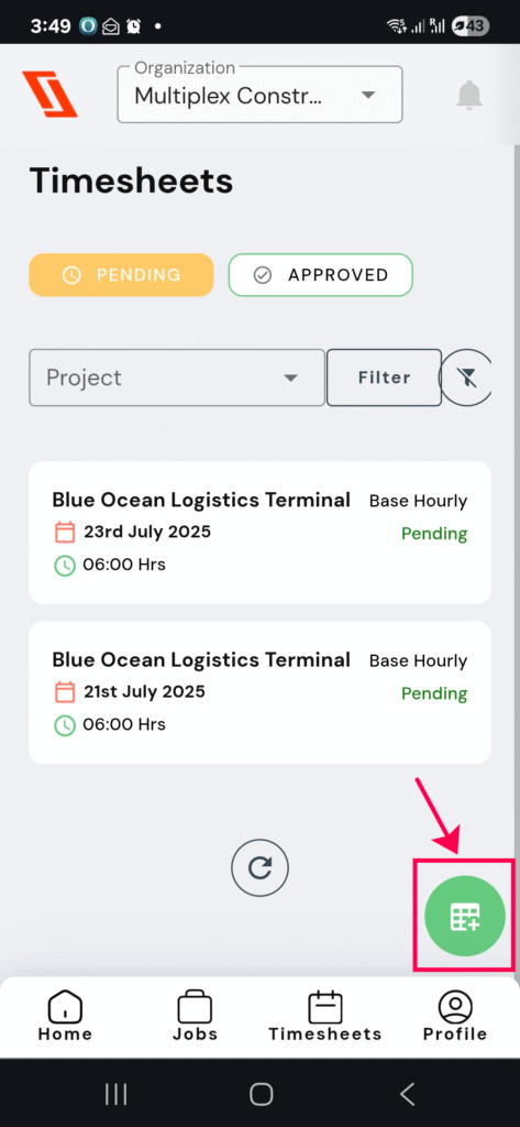 To get into timesheets, click on the “Timesheet” icon located at the right bottom corner of the homepage.