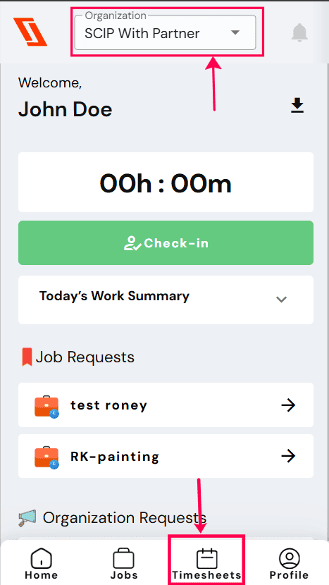Once logged in either via mobile app or web browser, you will be directed to the homepage of the ‘Swift Checkin’ mobile app with your current organisation/subcontracting company details displayed on the top.