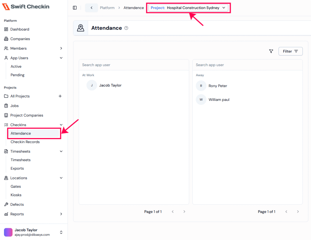 Step 1: From the main dashboard, go to CheckIns and select “Attendance”, choose your project from the dropdown.
