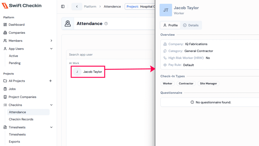 Step 2: Click on an onsite app user displays both profile and check-in details, while for offsite users, only the profile is shown.