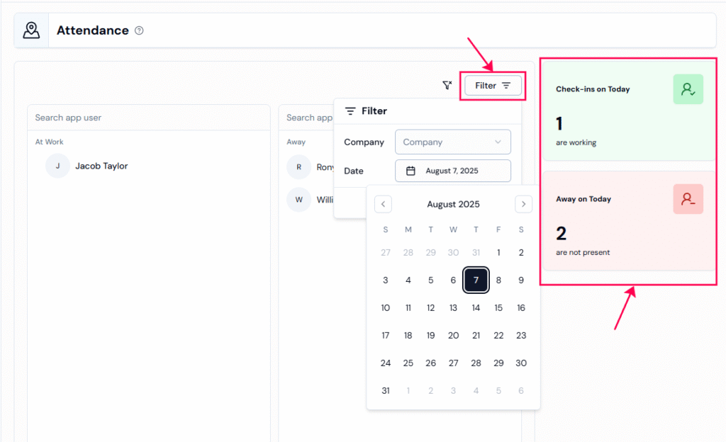 Step 3: You can use the filter button to view attendance for a specific date or company.