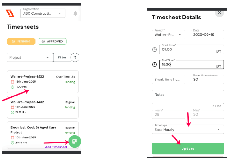 Step 3: On the Timesheet page, under the “Pending” tab, select the project for the specific day on which the overtime is done. This will take you to the timesheet details, including date, project, time, etc., in correlation with the site check-ins.