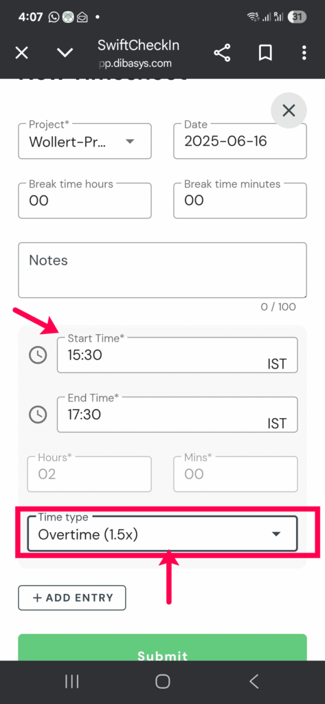 Step 5:Click on “Time type“and select Overtime (1.5x) or Overtime (2x) as determined by your organisation. Utilise “Add entry” button for multiple entries.